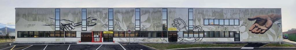 Cette œuvre est née d’une contrainte. En effet l’implantation du bâtiment fait qu’une mousse est apposée sur la surface des murs. Pour des notions écologiques et le fait de s’adapter à la nature, le choix s’est imposé de jouer avec elle. Toutes les parties blanches ont été seulement nettoyées et dessinées à l’aide d’un karcher! La main permet d’attirer et d’orienter le regard du public dès l’arrivée sur le site vers la zone de dons. C’était pour moi une façon différente de travailler mais j’étais satisfait de travailler pour la métropole Grenobloise surtout dans ce cadre écologique.