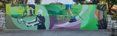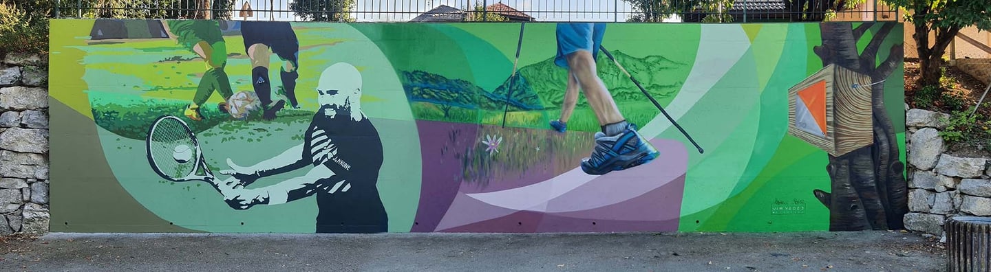 La commune de Viry en Haute Savoie nous a commandé cette fresque pour redonner vie à cet ancien mur de tennis. L’espace délaissé a été converti aujourd’hui en un espace de street workout. Le but de notre travail était de représenter différents sports pratiqués dans la ville dans une harmonie de couleurs douces et apaisantes, par la refonte totale de son environnement. Le travail de réflexion en amont avait toute son importance.