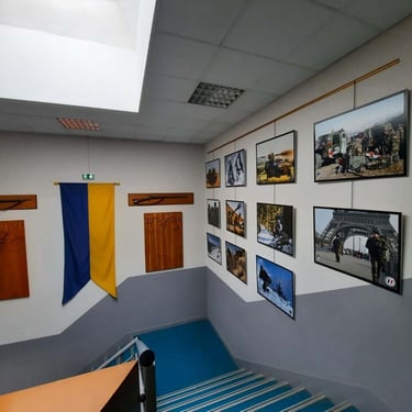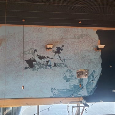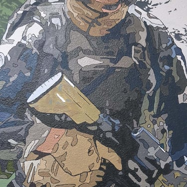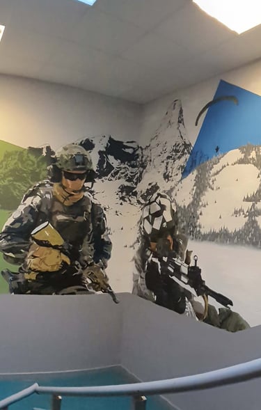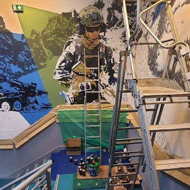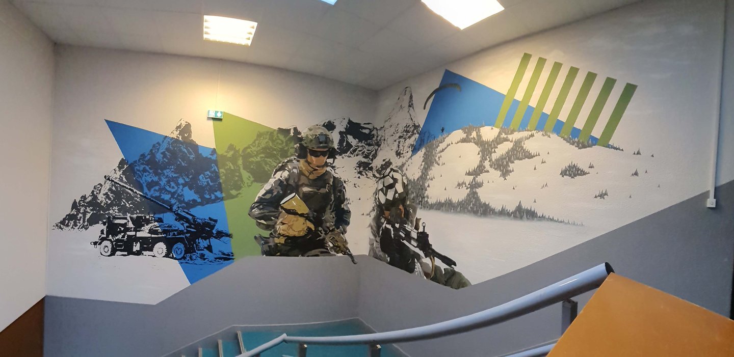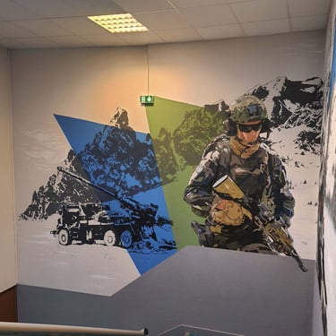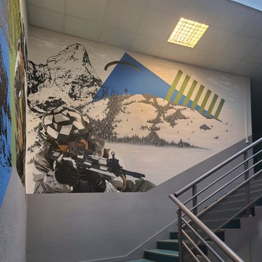La base militaire de Varces a fait appel à moi, dans le cadre de cet embelissement pour redonner de la nouveauté à l’espace. Il était muni de cadres photos et de fanions vieilissants. Le but était de représenter les différentes activités de la caserne. Après concertation avec la direction nous avons choisi différents éléments et couleurs pour la fresque. Ceci a rendu le lieu plus familier pour les soldats empruntant cet escalier quotidiennement, et a réelement rendu ce passage plus original. La réalisation de cette œuvre n’était pas simple car haute et dans un escalier en angles ce qui rendait la performance assez risquée mais ce fût un honneur de travai ler avec minutie pour les chasseurs alpins pour cet espace menant au bureau du commandant.