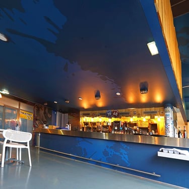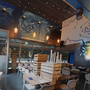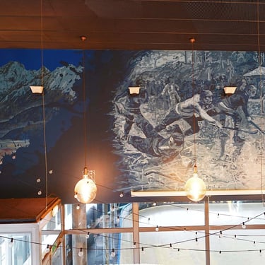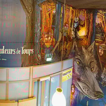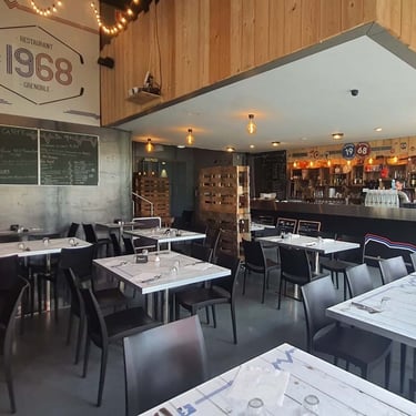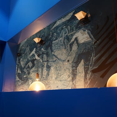En arrivant dans le lieu, les murs étaient gris et rose. Mis à part quelques éléments décoratifs, le bar 1968 ne reflétait pas l’univers de la patinoire dans lequel il se trouve. Il accueille les fans des Brûleurs de Loup les soirs de match. La refonte entière de l’espace avec cinq fresques différentes et un bleu nuit vinrent unifier le tout afin de donner une âme à ce lieu. Cette performance de taille révèle beaucoup de détails pour ceux qui s’y attardent, mêlant histoire et présent, pour accroître la renommée de ce bar emblématique et le rendre plus attractif par son originalité. Il est difficile de montrer cet embellissement dans son ensemble en photo à cause de sa taille considérable et de toutes les différentes scènes qui la composent et qui donnent une histoire à ce lieu