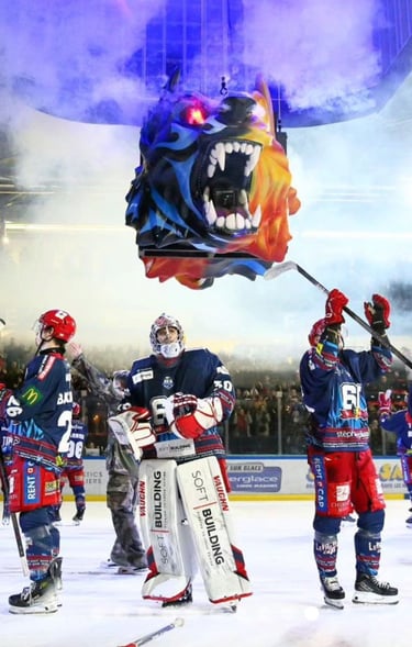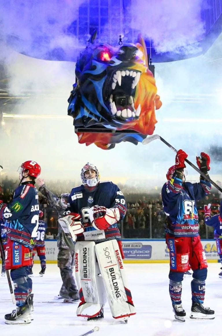 L'équipe de hockey “les brûleurs de loup” nous on appelé pour remettre une couche de nos talents de peintre à leur tête, à l'effigie du logo de la patinoire de Grenoble. Cette sculpture est mise en place a chaque ouverture de match et présentée comme un porte bonheur qui crache du feu et motive l'équipe et ses supporters